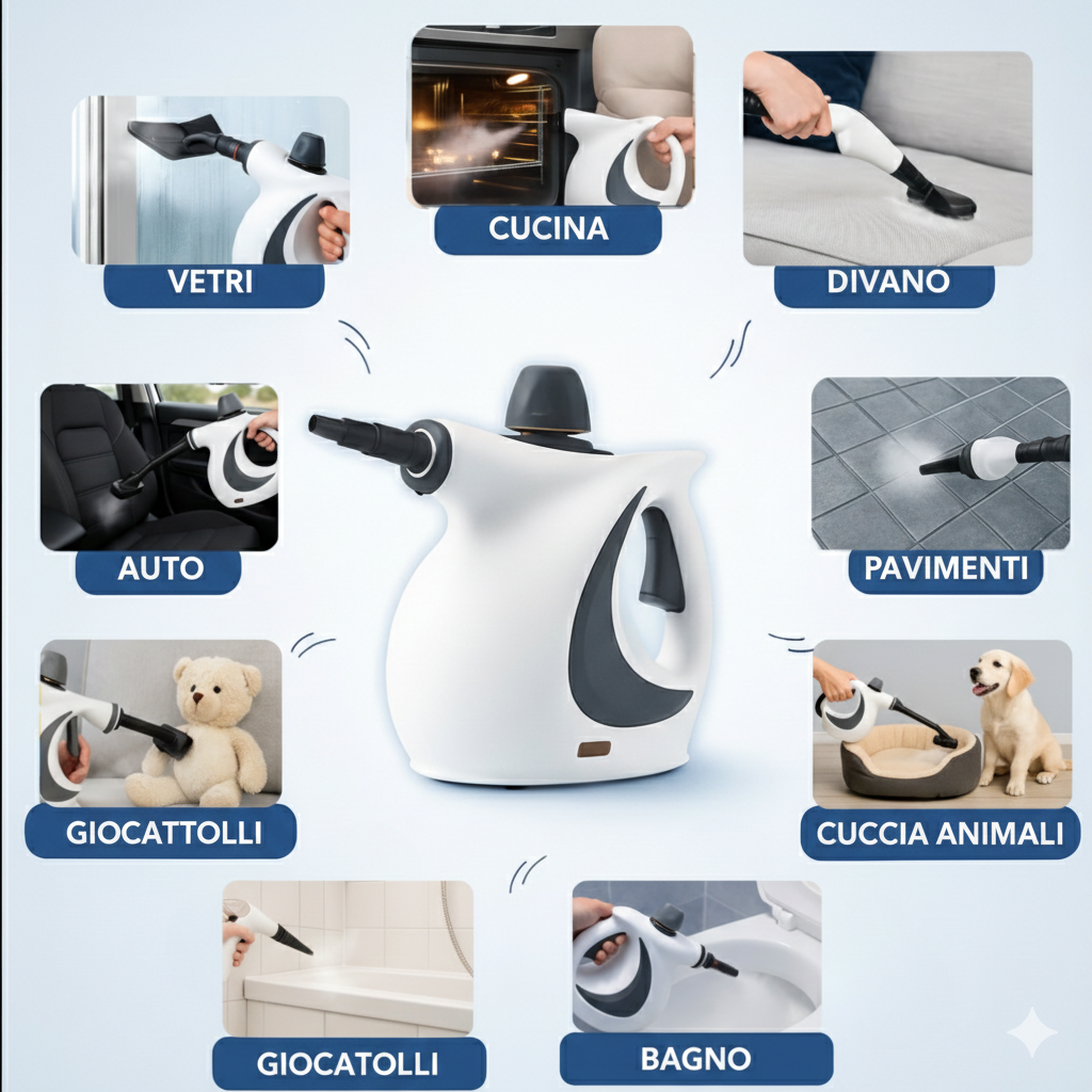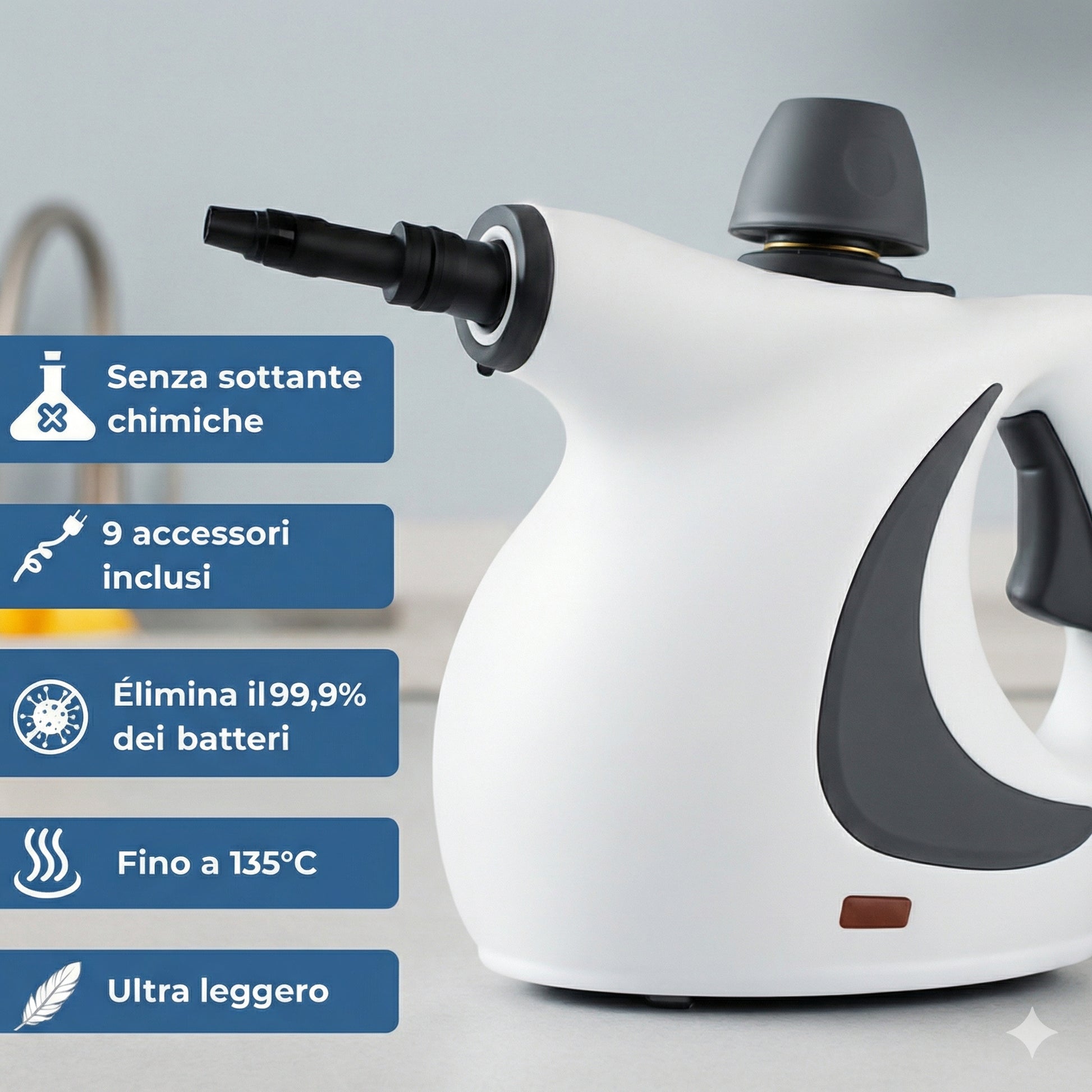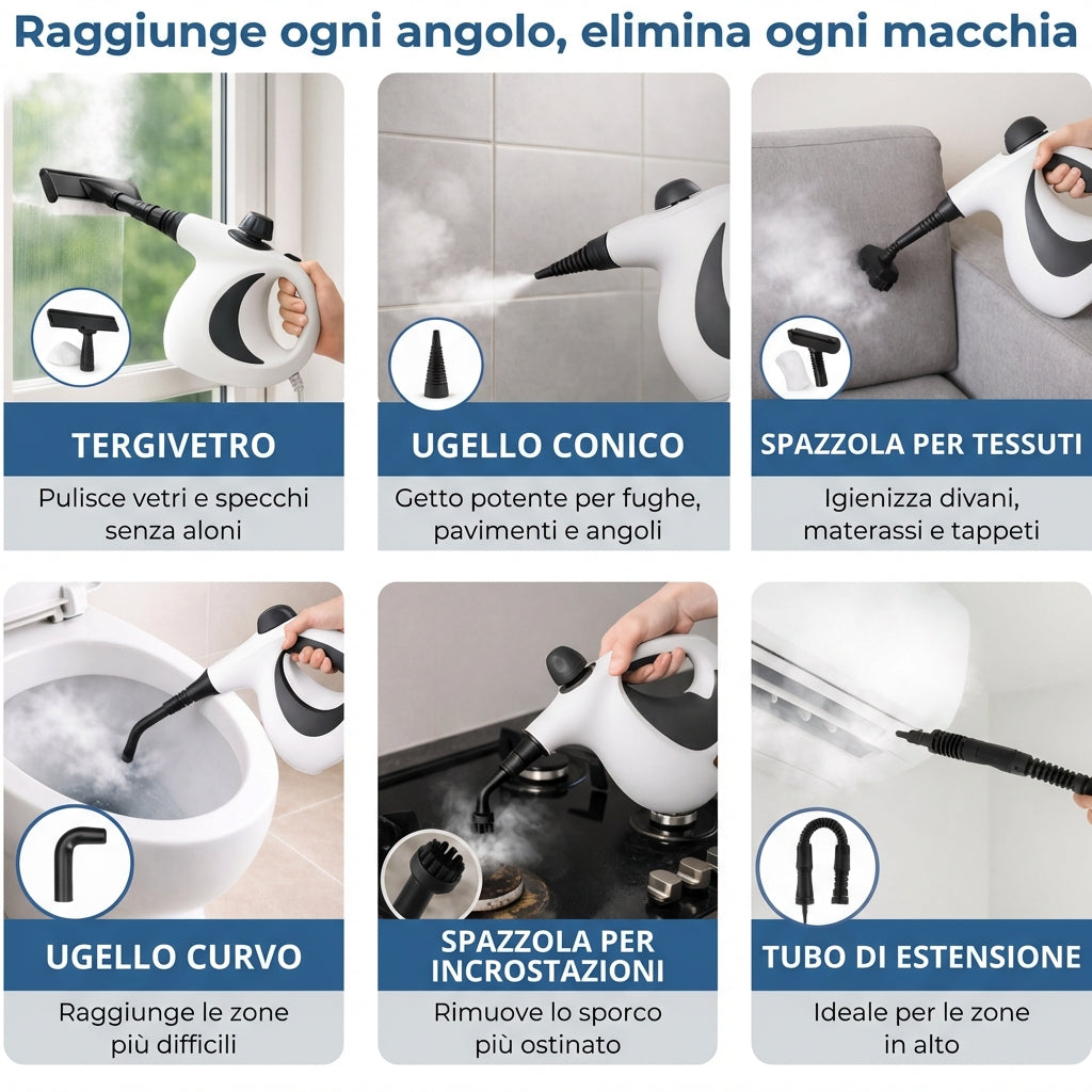 🦠 Muffa su pareti o fughe? Il vapore caldo la elimina naturalmente, senza prodotti chimici, igienizzando anche le zone difficili da raggiungere.